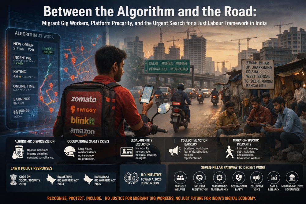 India’s gig and platform economy, employing approximately 7.7 million workers as of 2020–21 and projected to absorb 23.5 million by 2029–30, is disproportionately built on the labour of internal migrant workers. Yet, this migrant-platform nexus remains one of the most under-researched intersections in Indian labour studies. This article presents a critical, research-based analysis of the structural vulnerabilities, occupational hazards, legal exclusions, and emerging policy responses affecting migrant gig workers in urban India. Drawing on the scholarly frameworks of Jamie Woodcock and Mark Graham (King’s College London / Oxford Internet Institute), the Indian labour political economy scholarship of Babu P. Remesh (Ambedkar University Delhi) and Praveen Jha (JNU), empirical research on the South Asian gig-migration nexus, ILO findings on decent work in the platform economy, and field evidence from Indian cities, the article identifies five interlocking domains of vulnerability: algorithmic dispossession, occupational safety crisis, legal-identity exclusion, collective action barriers, and migration-specific precarity. Against this landscape, it evaluates India’s nascent legislative responses—the Code on Social Security 2020, the Rajasthan Platform Based Gig Workers (Registration and Welfare) Act 2023, and the Karnataka Act 2025—alongside the ILO’s standard-setting initiative culminating in the expected 2026 Convention, and proposes a seven-pillar policy roadmap grounded in the ILO’s Decent Work Agenda. The article argues that genuine protection for migrant gig workers requires not just legal reform but structural redesign: portable welfare identities, algorithmic transparency, mandatory safety infrastructure, and migrant-inclusive registration systems.