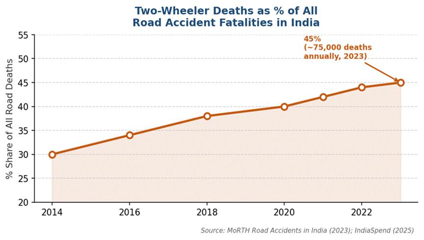 Figure 3: Two-Wheeler Deaths as % of All Road Fatalities, India (2014–2023). Source: MoRTH (2023); IndiaSpend (2025).