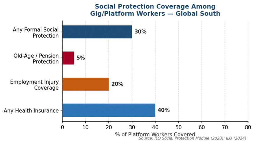 The International Labour Organisation has developed the most comprehensive global framework for platform worker protection. The ILO’s World Employment and Social Outlook 2021 documented the rapid growth of digital labour platforms from 193 in 2010 to more than 1,070 by 2023. It was established that most workers in the Global South rely on platform work as their primary source of income. The ILO’s research has consistently found that only about 40 per cent of platform workers have any health insurance, less than 20 per cent are covered for employment injury, and old-age protection is nearly non-existent (ILO Social Protection Module, 2023).