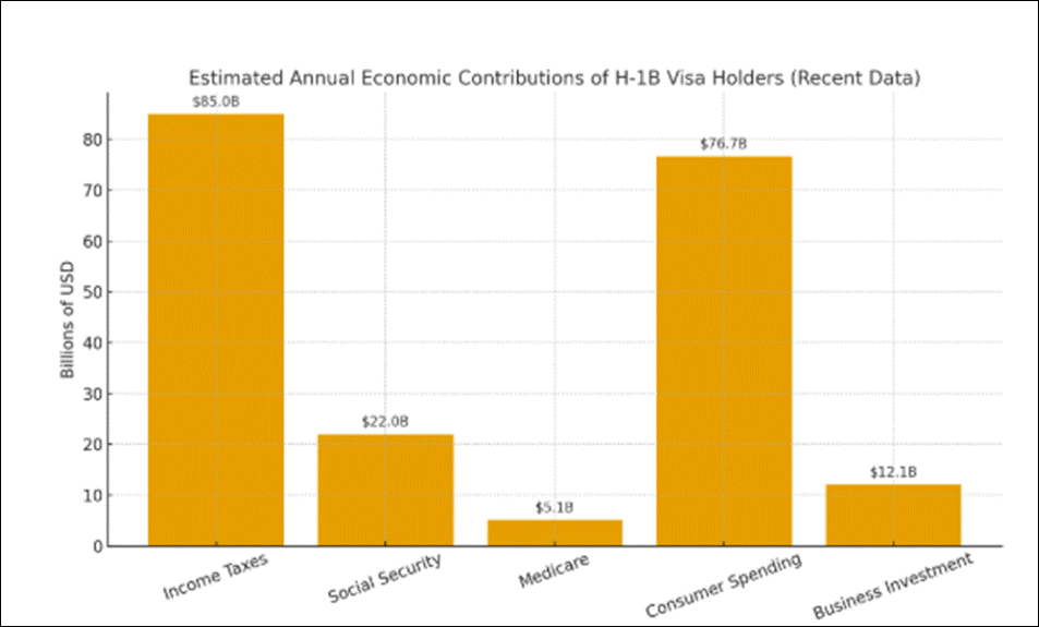 The H-1B policy shift is predicted to have a broader economic implication on economies of the countries involved i.e majorly United States of America and India. The H-1B visa card holders are not just immigrants but rather active contributors to the economy as indicated in figure 6 which shows the estimated annual contribution of H-1B visa card holders in the US economy. These workers are not simply filling existing jobs, they are often crucial drivers of new patents, the establishment of new companies, and the development of cutting-edge technologies etc.