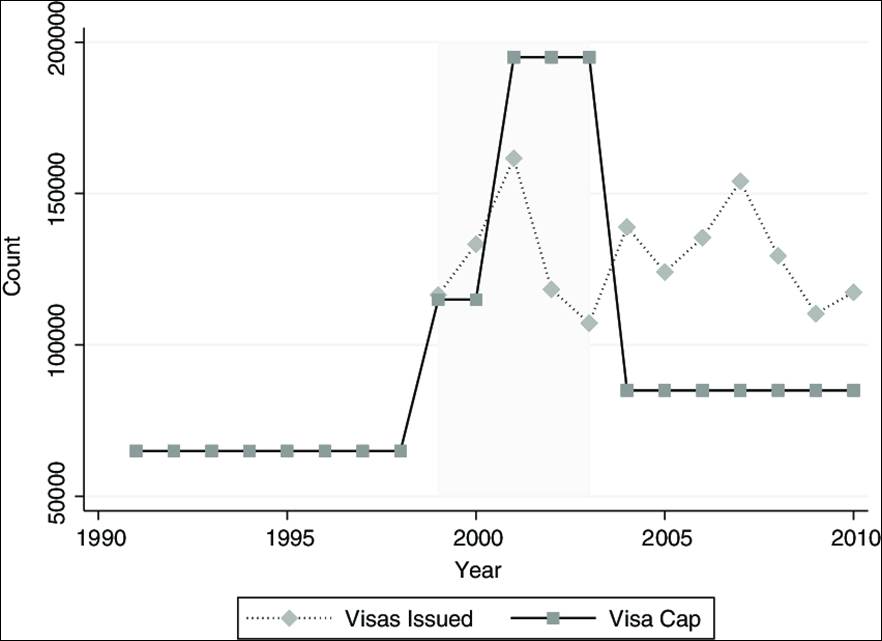 Figure 2: the H1B visa cap and visa issuances over time