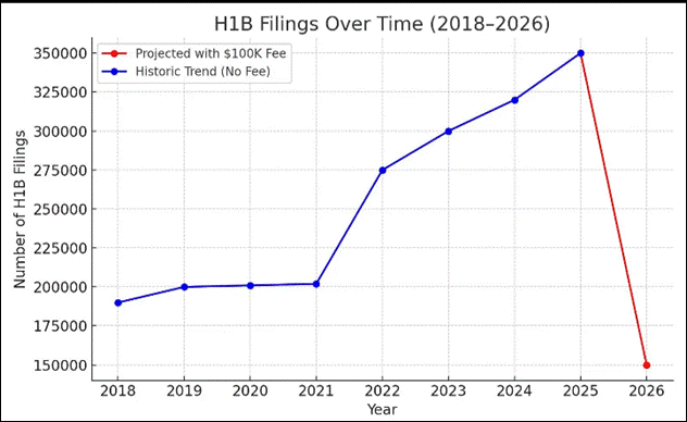 Figure 3:Line graph showing projected drop in filings after the $100K fee takes effect.
